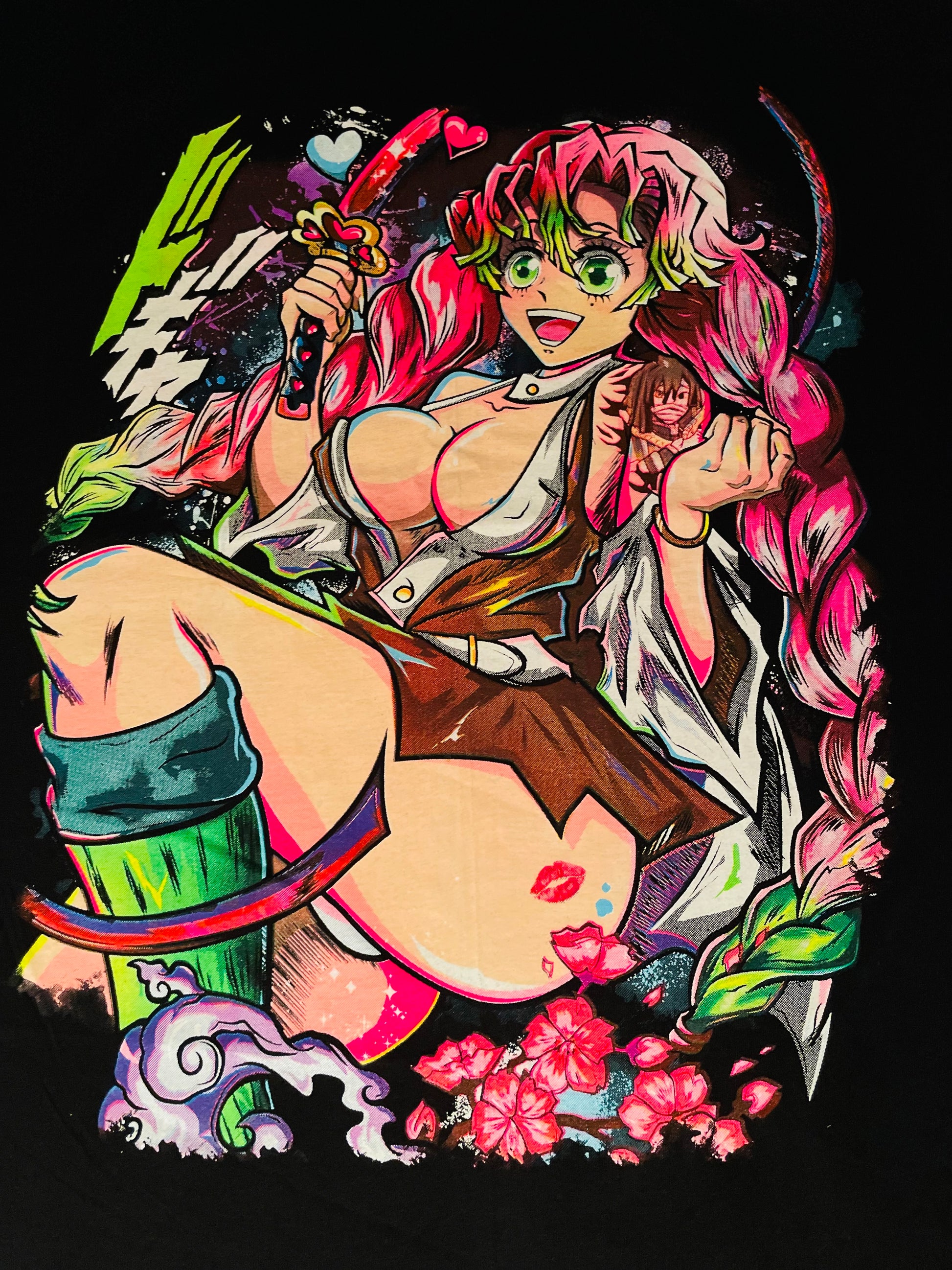 Bring the Love Hashira to life like never before. This bold Mitsuri Kanroji shirt features the iconic Demon Slayer beauty in a provocative, flirtatious pose designed to turn heads and break necks. But that's not all; this shirt glows under UV light, making it perfect for raves, conventions, or any late-night flex.