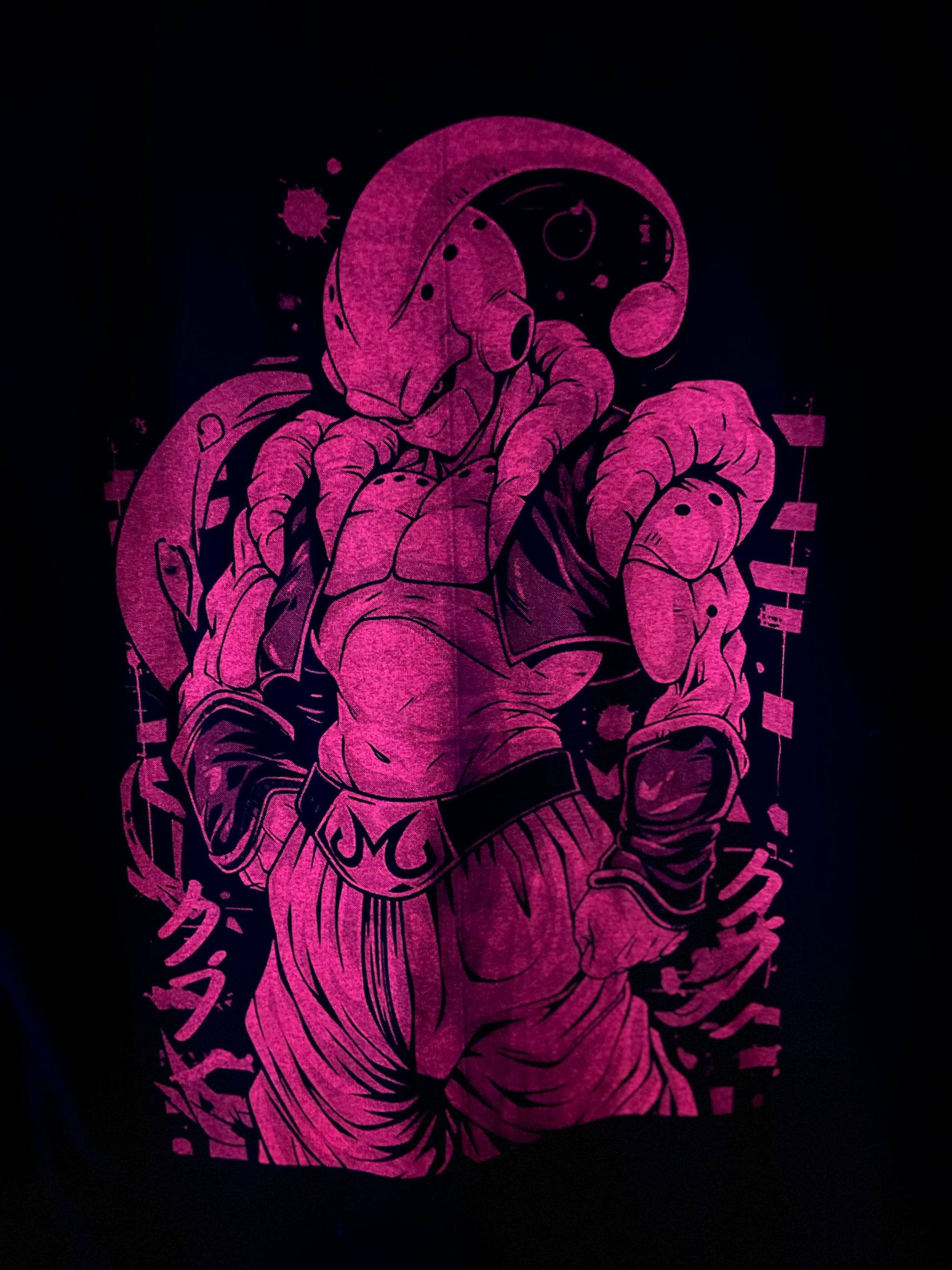 💥 Back print: Majin Buu fully revealed — arms up, aura glowing, menace unleashed