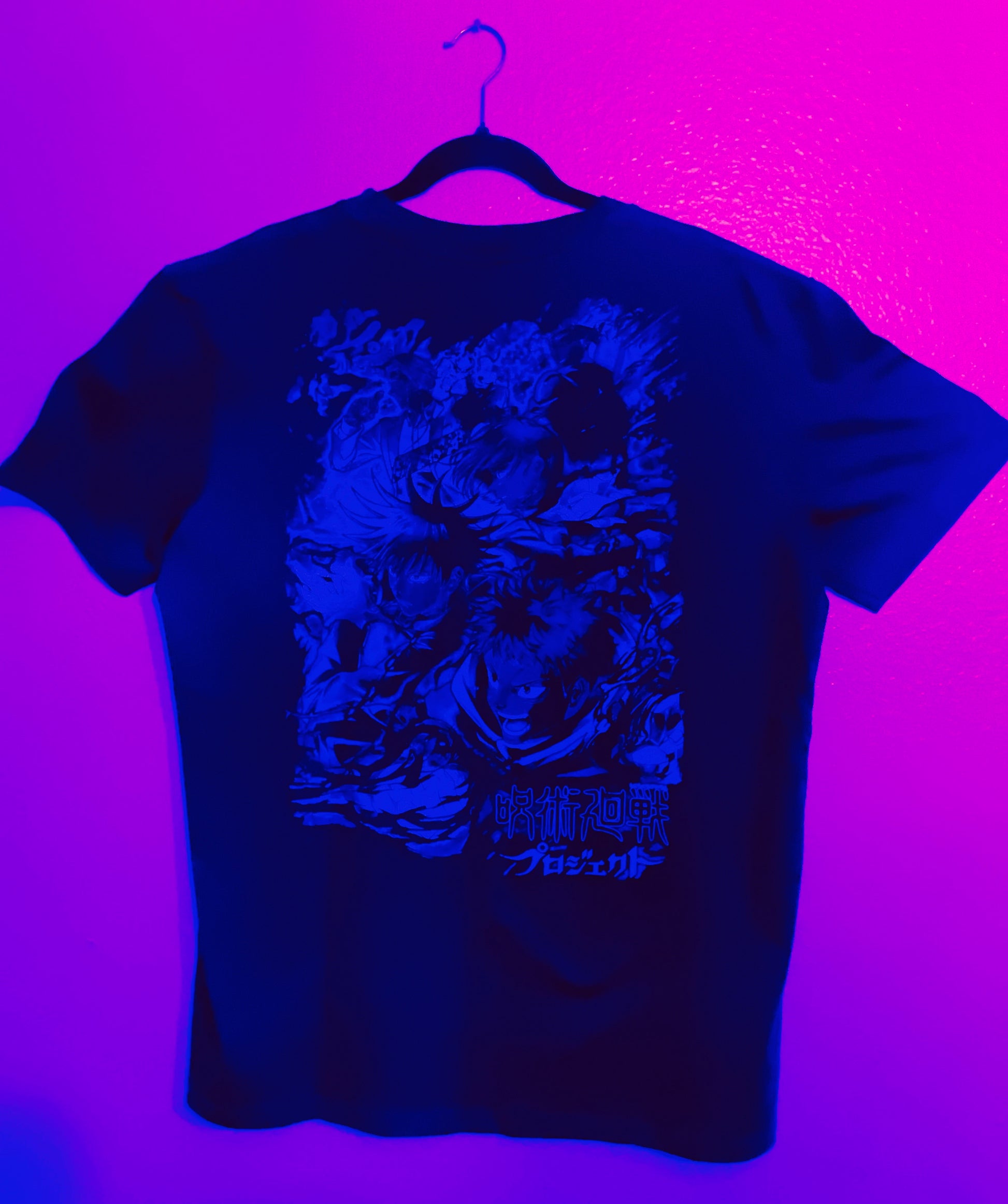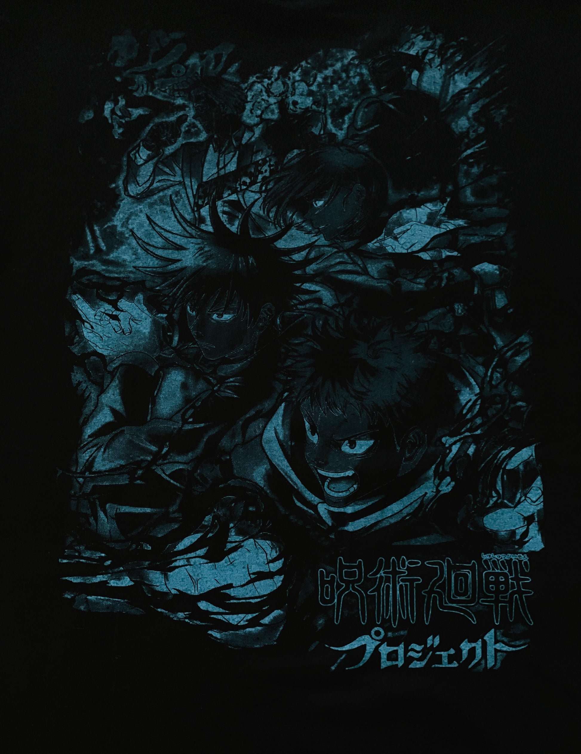 Back of Shirt: Tokyo Jujutsu High Students: Megumi Fushiguro, Yuji Itadori, and Nobara Kugisaki (attacking) blue color vibrant design.