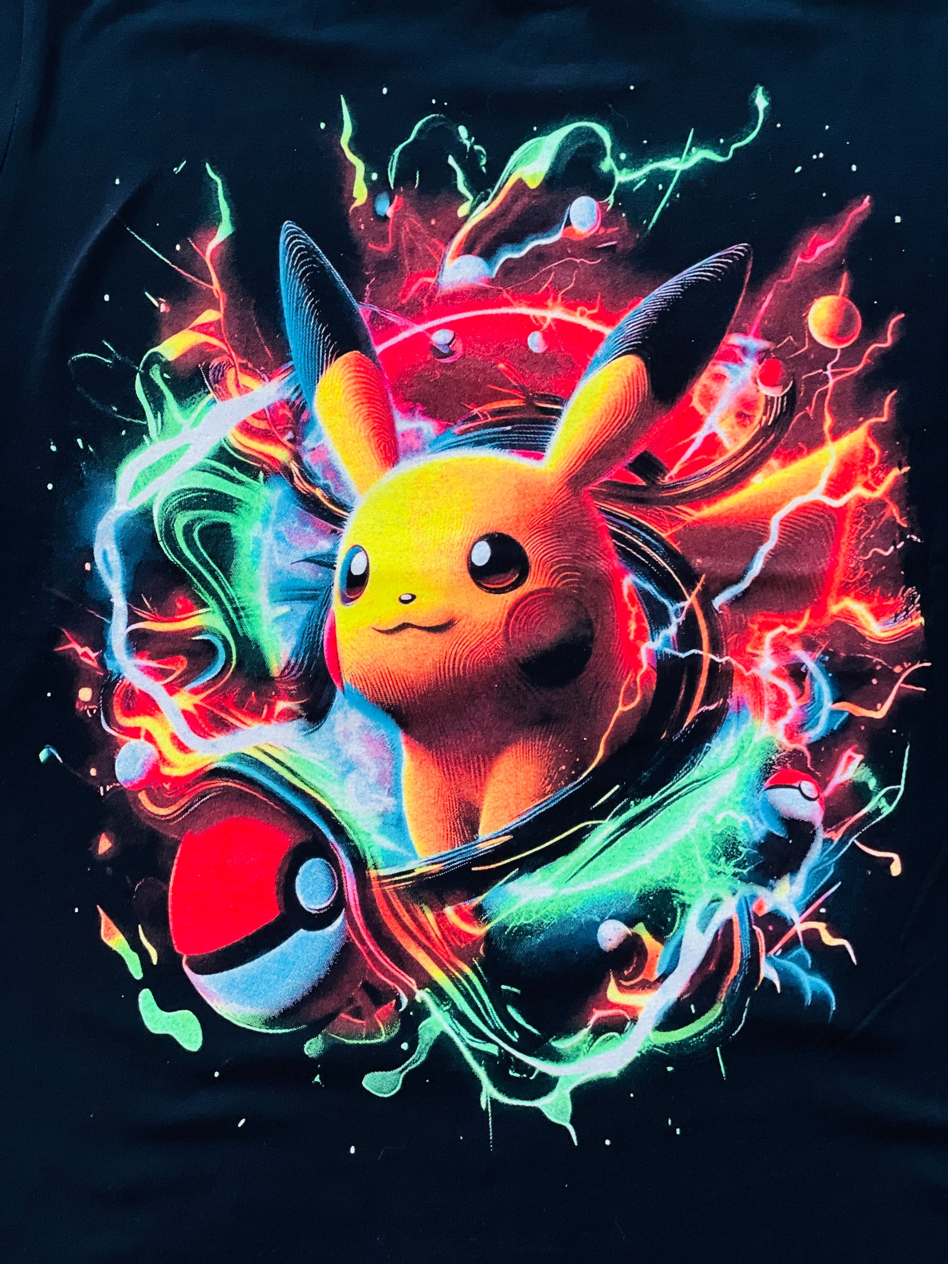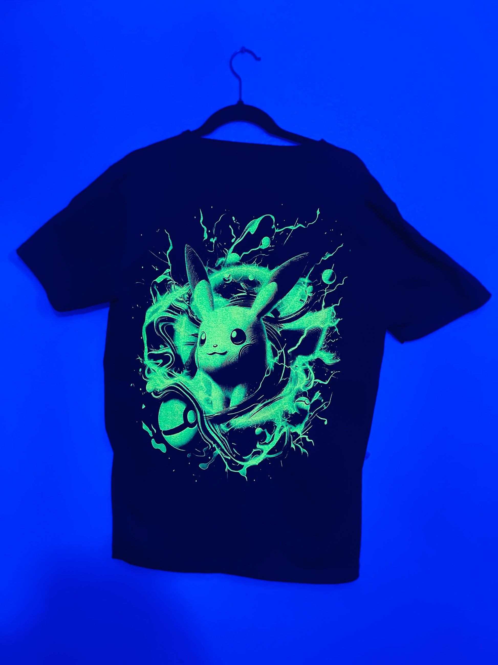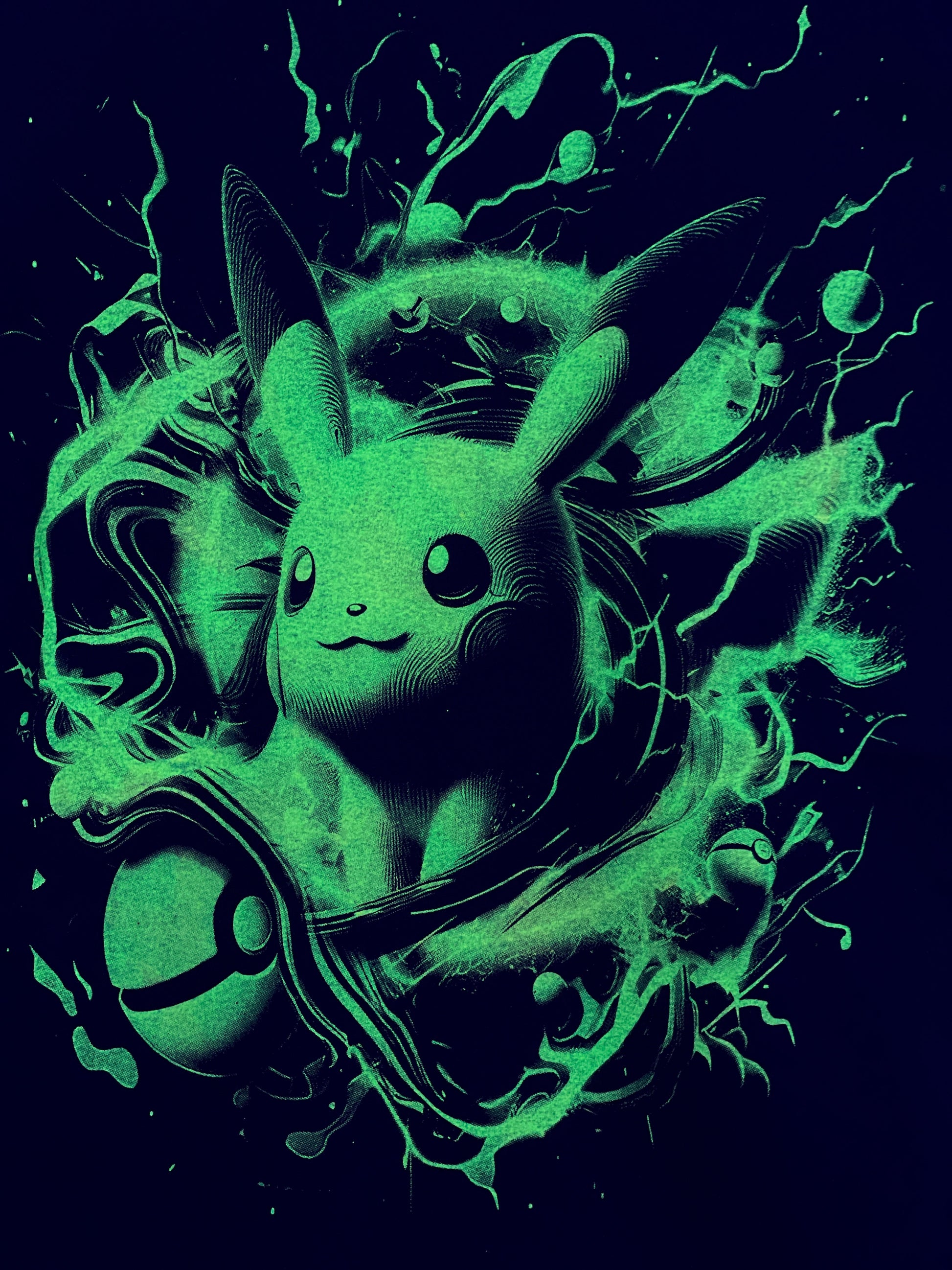 💥Back: Pikachu calm yet commanding, glowing with one solid yellow neon color w/pokeball.