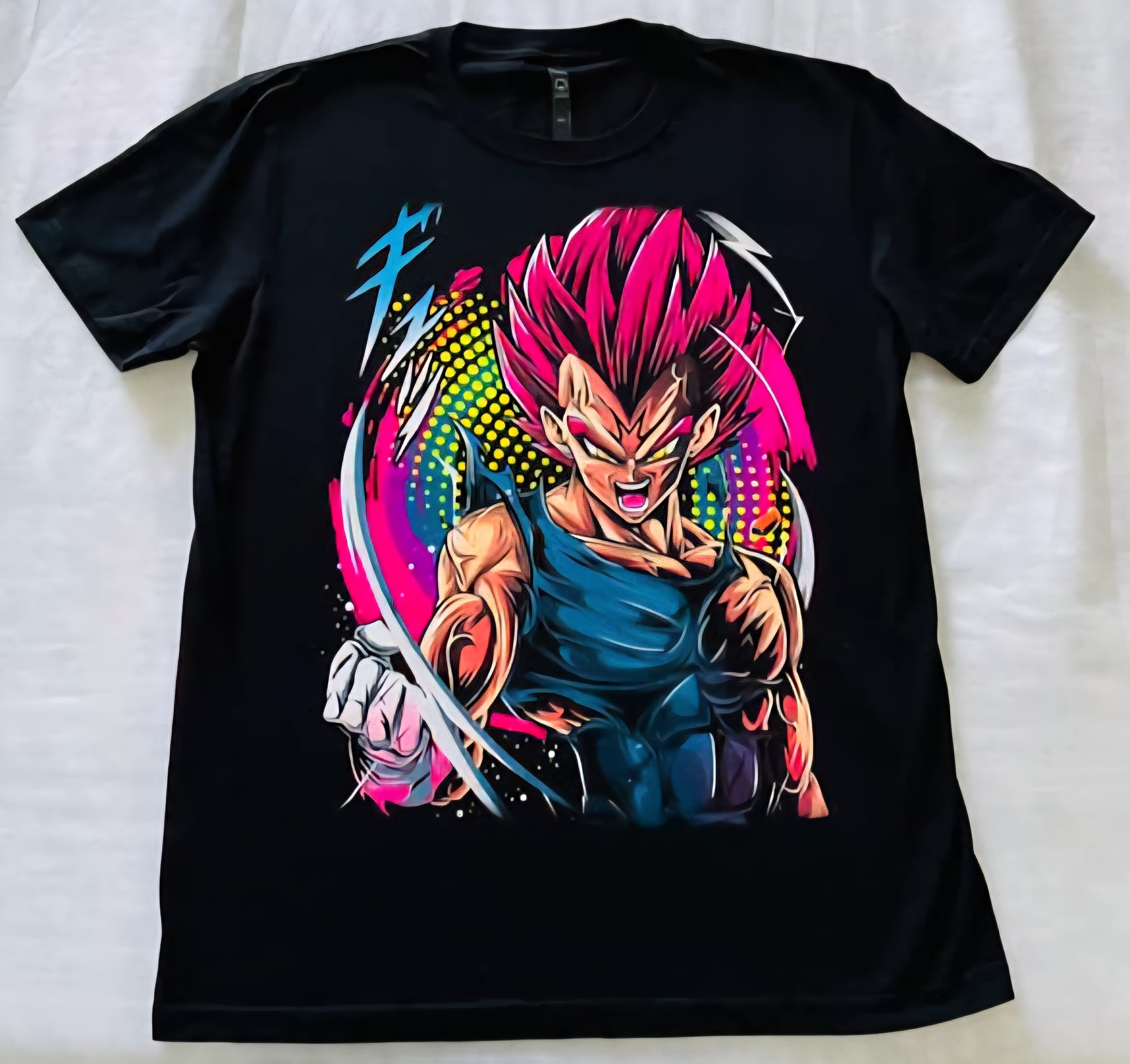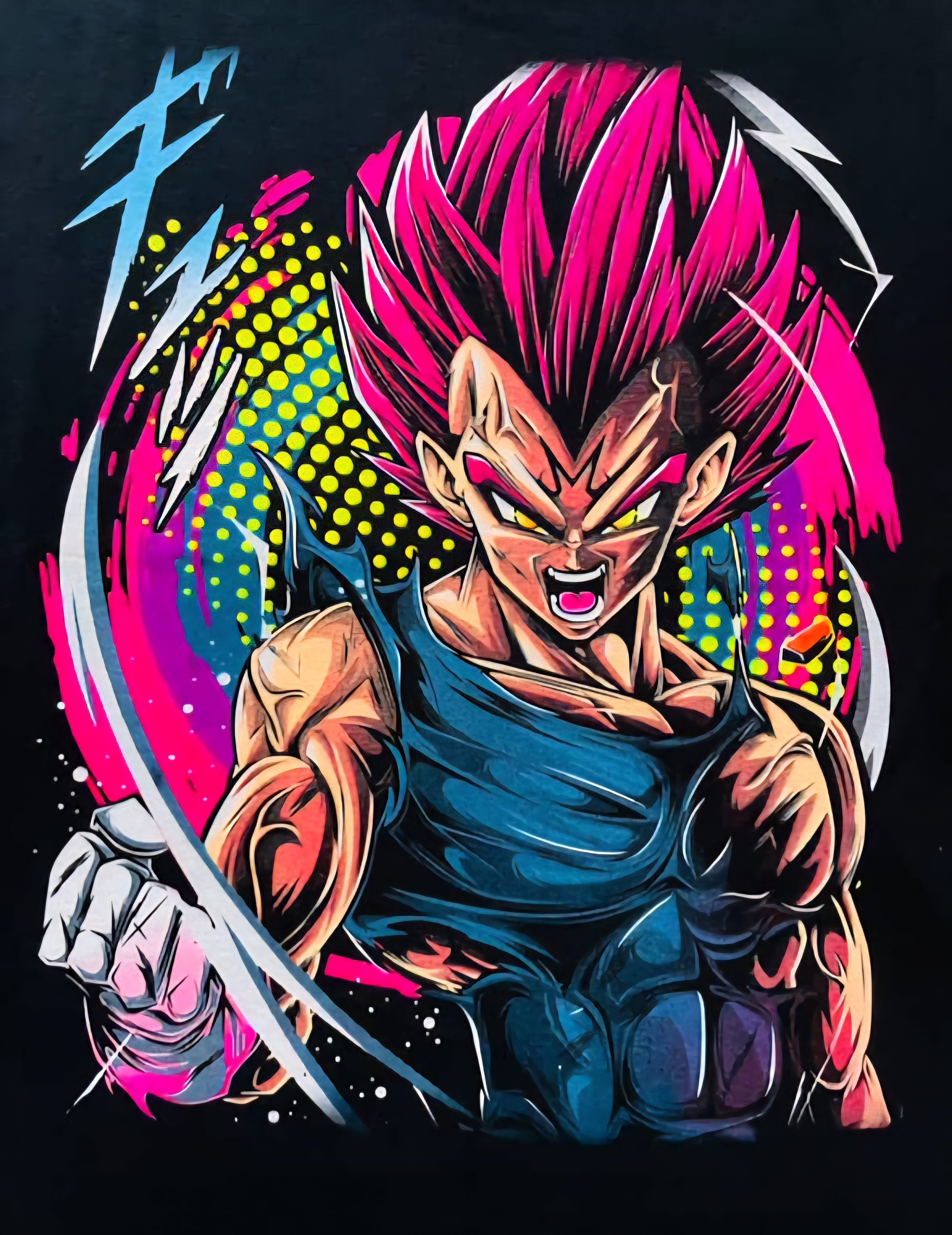Channel pure Saiyan pride with this Majin Vegeta masterpiece. The front bursts with electrifying neon-fuschia energy as Vegeta stands in a shadowed, intense stance, the background sparking with raw power. The back showcases a glowing blue silhouette of Majin Vegeta, his aura crackling — a bold nod to his most unforgettable form.